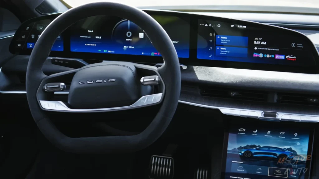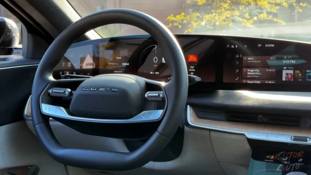 As you open the door, the first thing that catches your eye is the dashboard. It’s got this cool horizontal layout, and the 34-inch curved 5K display kind of floats above everything else, giving it a futuristic feel. Unlike some other cars that have ditched physical buttons completely, Lucid has kept some essential switches for climate and other frequently used features. Thank goodness! It’s so much better than having to poke through endless touch menus just to change the temperature. The two-spoke steering wheel fits right into the minimalist aesthetic, yet it’s super user-friendly for things like audio control and cruise settings. For those who go for the higher trims, there’s a flat-bottomed steering wheel that adds just a hint of sportiness without getting in the way of functionality.